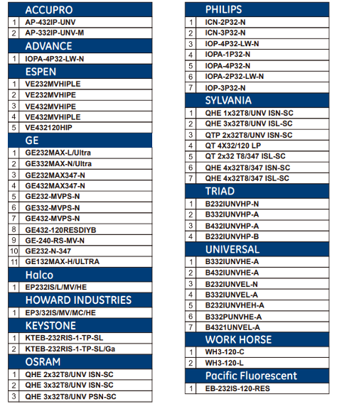 Compatible with the following ballast