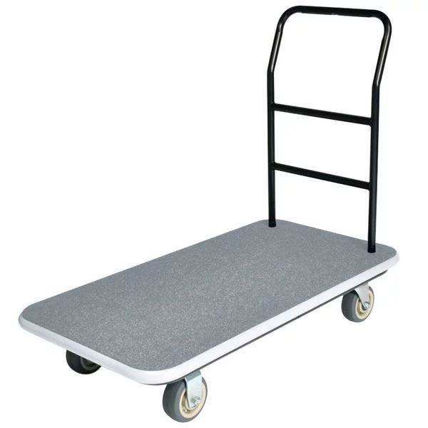 Quickly and easily move boxes and supplies with the gray carpet general purpose utility cart. Each cart has an upright handle that makes it easy to control without bending over. Additionally, this cart is on 5" polyurethane casters which roll easily so that your staff can move the heaviest of loads without strain. The size of this utility cart means it can fit into most elevators, thus making it a perfect choice for large hotels, convention centers, or apartment buildings.